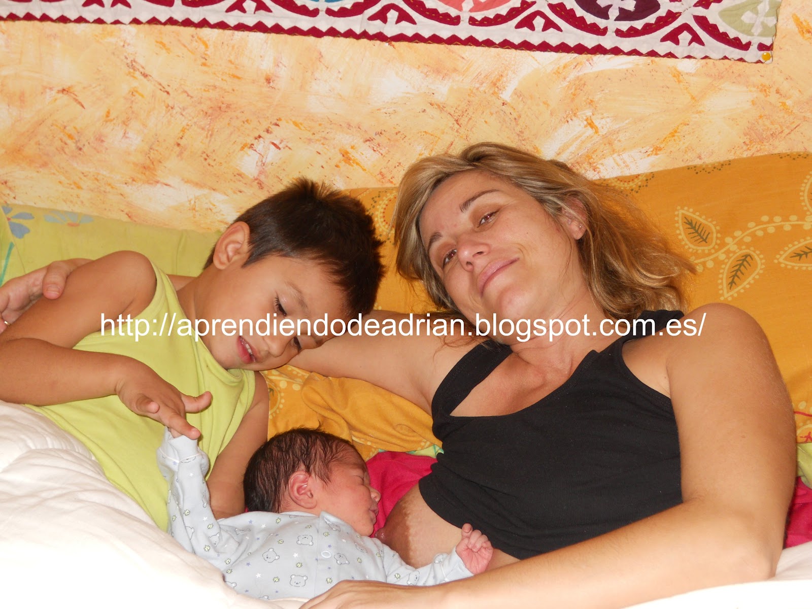 Minutos después llegó Karen, nuestra matrona, embarazada de 7 meses. En ese momento, salí durante unos segundos de mi "planeta parto" y pensé en cuánta energía vital había allí concentrada. Yo pariendo, Karen embarazada, Sofía con su sonrisa y su positividad . Salva, mi dulce amor, con su mirada tranquilizadora y sus manos fuertes acariciándome y Adrián , mi niño grande, durmiendo placidamente en la habitación de al lado.
